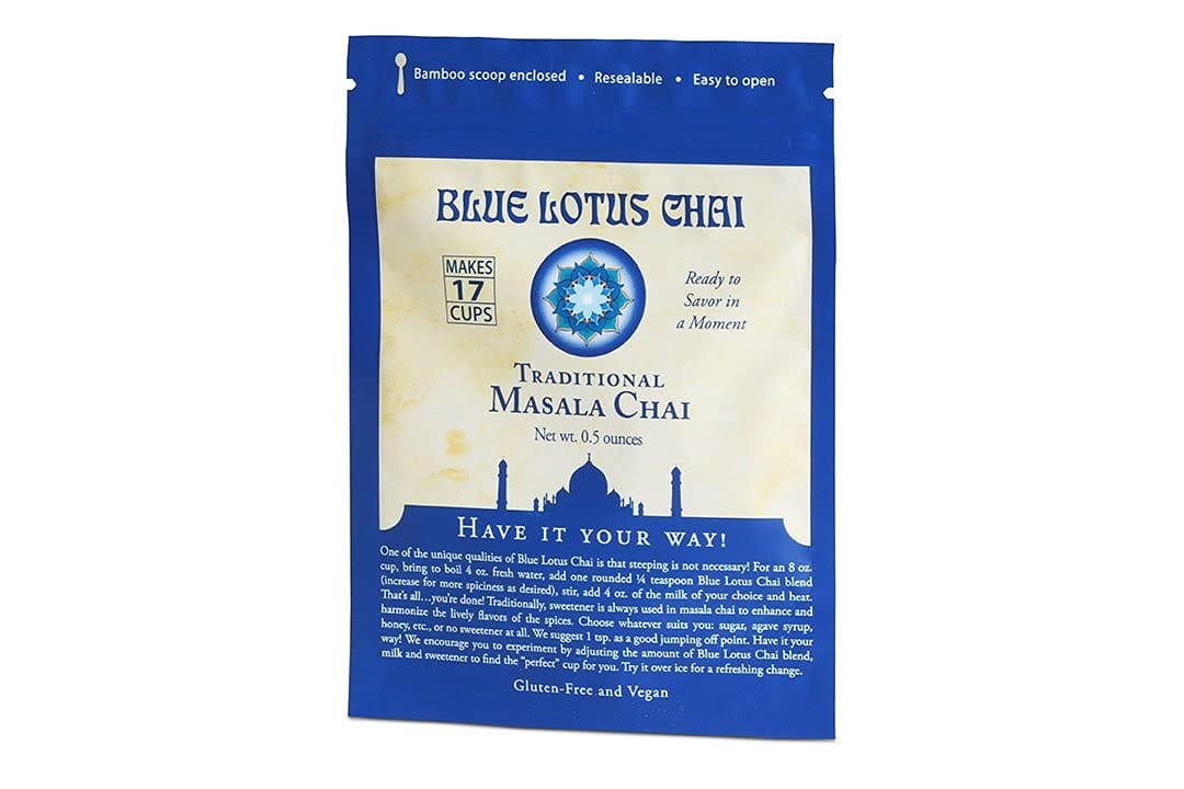 If you want a great instant tea that makes a cup of chai in seconds then get this Traditional Blue Lotus Masala Chai Tea Pouch.